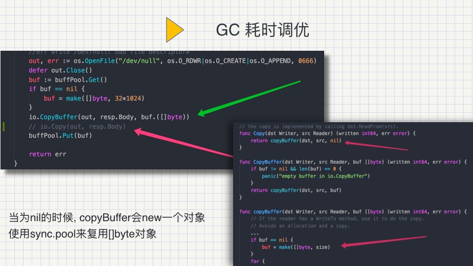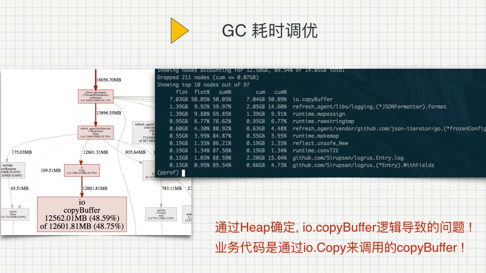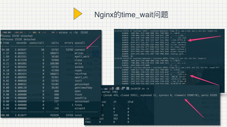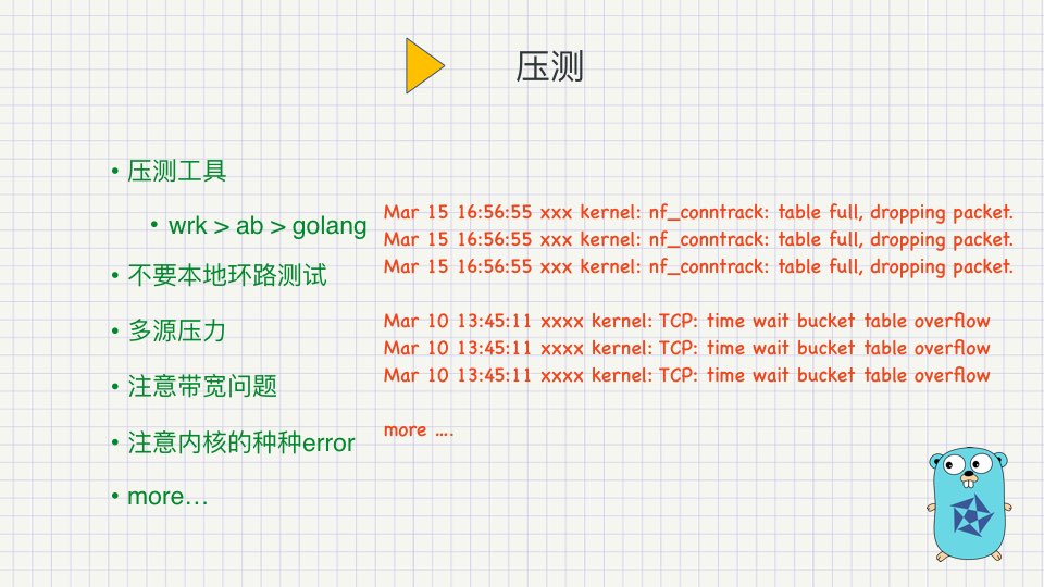 ppt中描述的项目是一个高频的cdn管理系统,我们在开发中遇到了不少的问题,大多数是可以通过pprof分析cpu, heap图来分析和解决的,配合perf top, strace 我们是可以统计syscall系统调用及stack的统计。对于有些tcp的状态,我们会使用tcpdump来抓包分析。