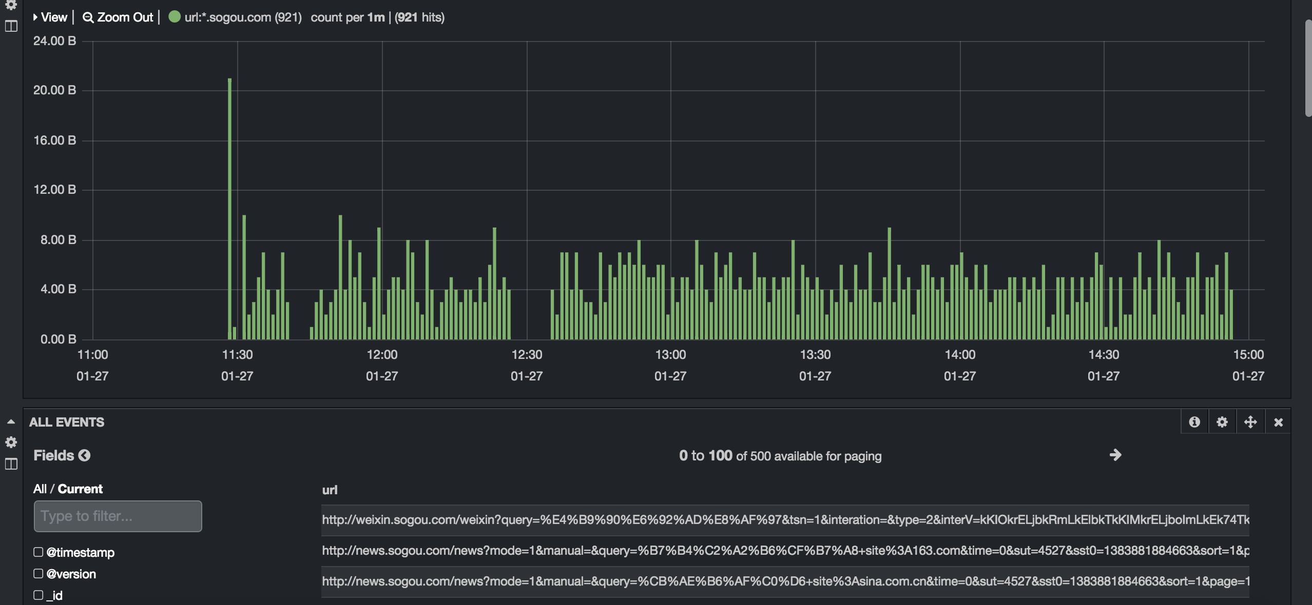 我们在kibana 3的界面上看到的结果,我这里是搜索下 时间周期里爬了sogou.com有多少次。