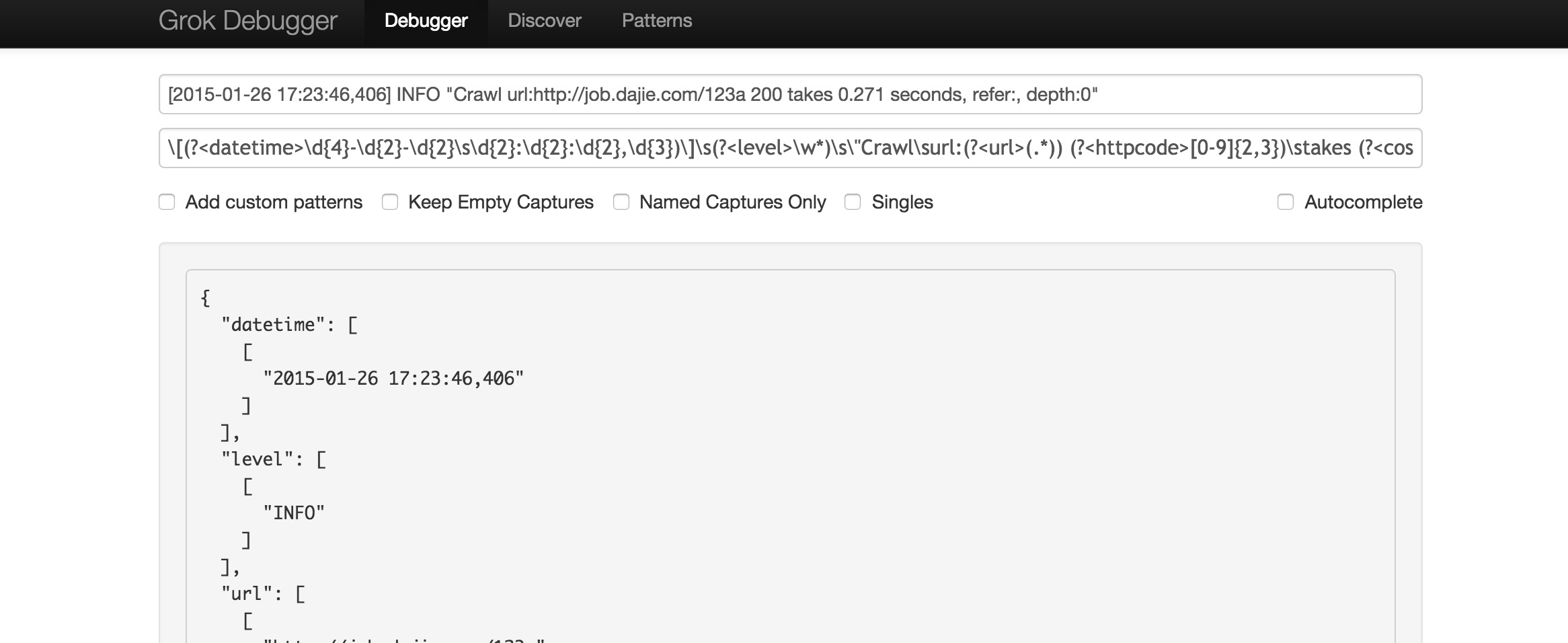 pattern => “\[(?<datetime>\d{4}-\d{2}-\d{2}\s\d{2}:\d{2}:\d{2},\d{3})\]\s(?<level>\w*)\s\”Crawl\surl:(?<url>(.*)) (?<httpcode>[0-9]{2,3})\stakes (?<cost>\d.\d\d).*”