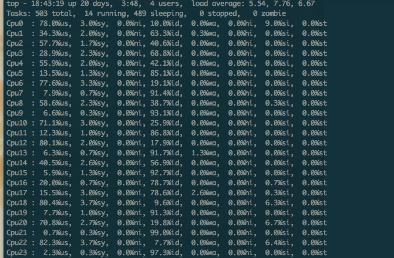 但是问题来了,这两天把抽取服务推送到线上后,总是有种使不上劲的感觉。 单纯的看cpu top,很些不尽人意。。。 在线上跑计算组件的时候,cpu消耗一般总是在90%左右,但是用docker跑的计算组件,会发现下面的问题,忽高忽低。 我跟同事也排查了各种情况,各种strace跟踪了下,没发现有问题,系统的版本及代码的版本,各个pip安装模块版本也跟线上一样。