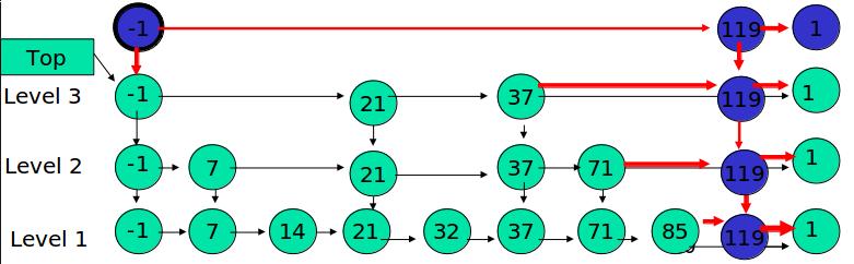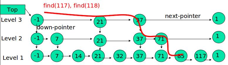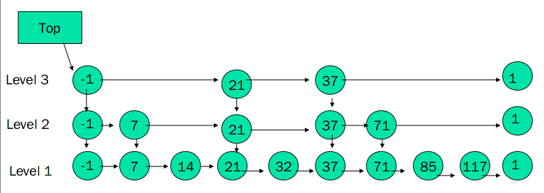 大家看下面的图片,一共构造了三层,根据上面的一些个特性,估计你也能理解一二了。   举个例子,你如果想查找14,那么先从第三层开始搞起,因为是有序的,所以14可以确定是在第二层的7和21之间,然后呢,再到第三层就能找到了。 他的一些算法是含有一些随机性的。