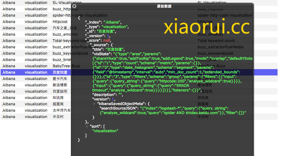 刚介绍了我这次的任务,就是配合PM做出一个业务的dashboard来,因为20个,确实有些多。 所以就想到了用批量脚本的方式添加。 但是没有搜到相关的文章,貌似kibana也没有什么现成的api可以用,难道大家都不关心批量添加图表的功能么? 我们每次调整kibana数据后,都会做保存处理,但是kibana的配置会存在哪里? 客户端? 但是他又怎么把这配置共享给别人呢 。 kibana4的服务端? kibana就是一堆的angular js组成的接口调度。 最后在es里面看到了kibana的配置,他的index名字是.kibana