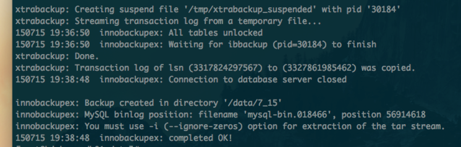 innobackupex –defaults-file=/etc/mysql/my.cnf –stream=tar –compress ./ > 7_15
