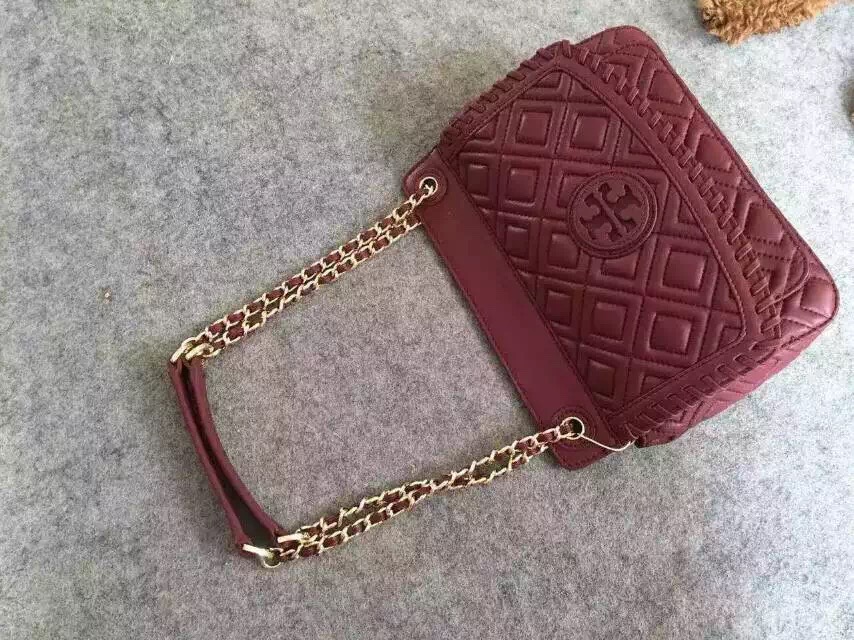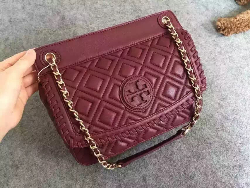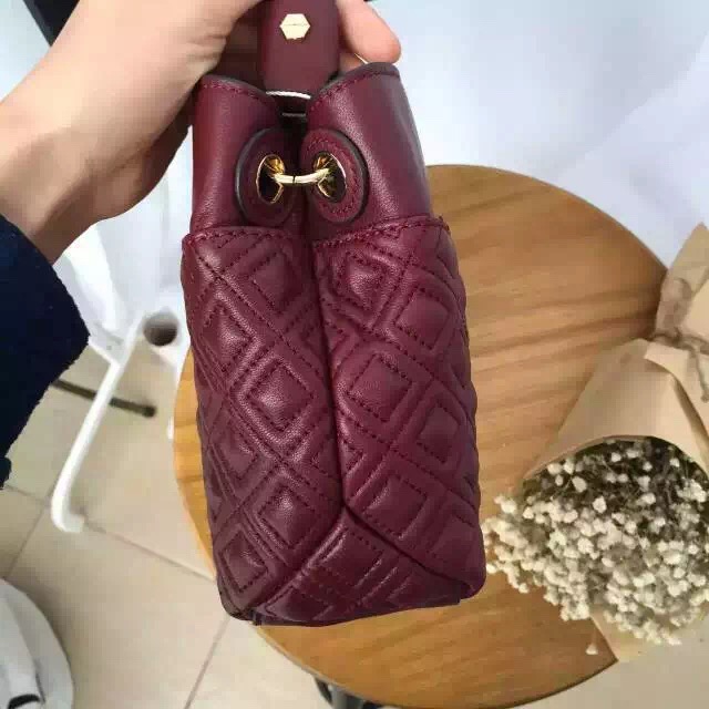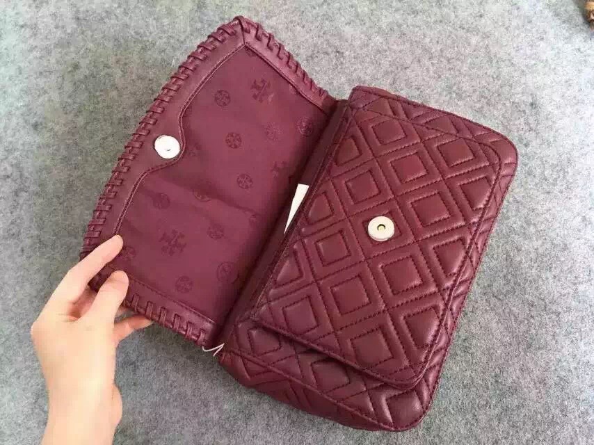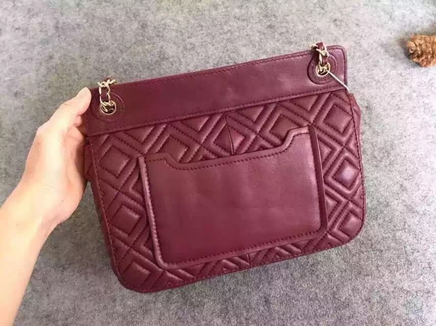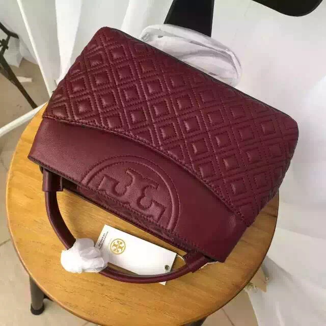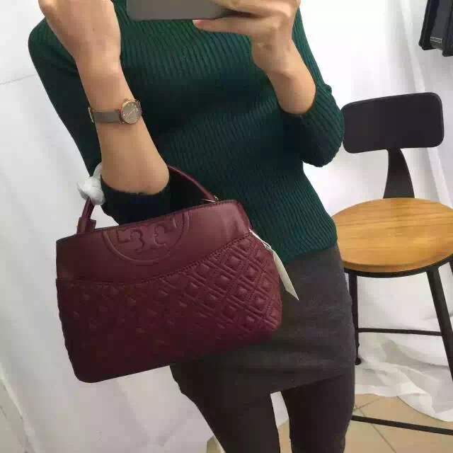 1050元 toryburch 弗拉明戈羊皮菱格纹复古手提袋 简约中不失柔美的感受 25*18*9 酒红色现货