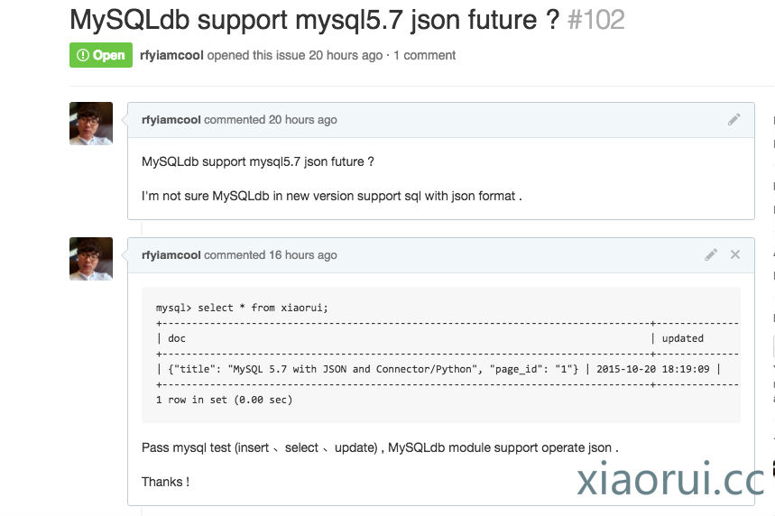 话说,MySQLdb原本就支持json,换句话说,对于MySQLdb来说,他发送的都是sql语句而已,原本就没有就不用接口的适配。   原本以为json是新结构,MySQLdb不支持,在github中提了一个issue问题。