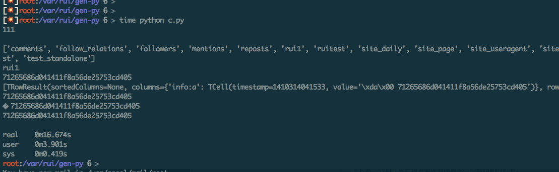 最后看了下源码,里面有个buffer ,咱们调用的时候,传递一个buffer值就行了 。 如果压力源如果的话,python thrift的写入速度是可以到1k左右的。 下面的那个测试是我在hbase的模拟环境搞的,他就几台服务器组件的hbase集群,性能一般,才到700左右。