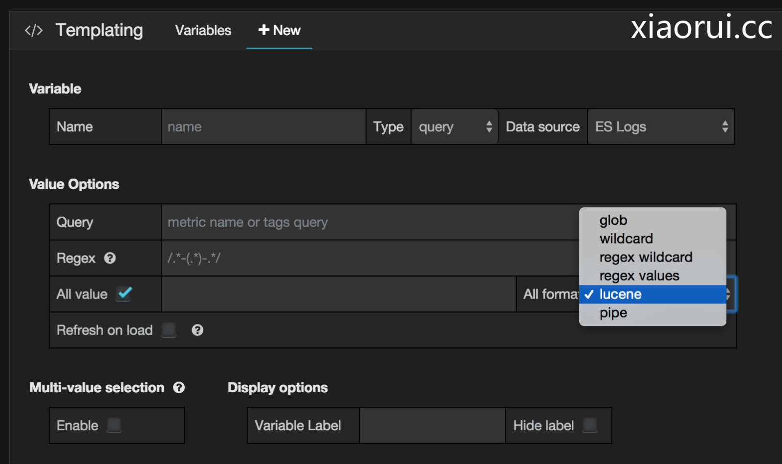修正上面的说法,grafana的新增图表里面,会有elasticsearch和ES LOG两项. 对于metric names字段也是有正则匹配的模式,对于具体的value是可以模糊匹配,正则匹配,lucene全文索引匹配规则.