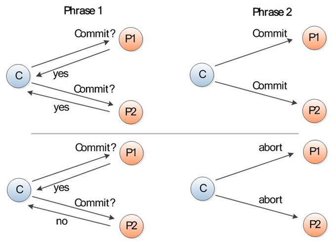 两阶段提交协议(Two-phase Commit,2PC)经常被用来实现分布式事务。一般分为协调器和若干事务执行者两种角色,这里的事务执行者就是具体的数据库,抽象点可以说是可以控制给数据库的程序。 协调器可以和事务执行器在一台机器上。