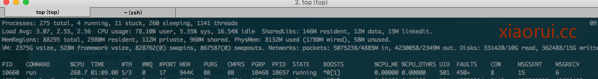 对于经常使用python multiprocessing多进程模块来跑多核多任务的我来说,不再有GIL全局锁是个很美妙的事情。 我们通过top可以看到上面的实例代码跑到了cpu 270% . 跟我们上面配置的runtime.GOMAXPROCS(3)相对应。