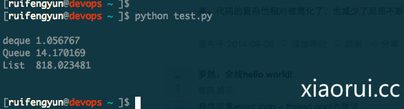 结果和我想的一样,deque很快,Queue也算可以,但是Queue只能做put,put的方向是不能指定的。list单纯的append算是不错的,但是如果你的应用有那种优先级的逻辑,那这样的话,你需要往前插入,用insert(0,item) 。 insert这个把item值插入到第0位,但是后面的那堆索引值,都要+1的。 这个负担可不小呀。