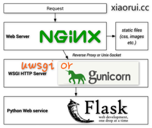 在架构上是这样的,nginx负责动态的转发和静态文件的直接访问,gunicorn和uwsgi作为网关服务用来解析http请求,后面的flask只是个application而已,没有server的服务特征。