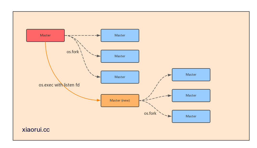 其实代码热更新也没必要设计成signal lazy reload的方式。我们可以参照nginx master worker的思想来实现热更新,达到不停机最少影响连接的热更新。 这里我使用Python实现的master worker框架,当然Golang和其他语言差不多也是类似实现。 下面是实现的基本步骤,代码我会整理出来扔到github里。