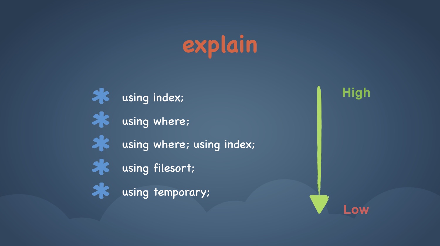 16. explain using index; using where; using where; using index; using filesort; using temporary; High Low