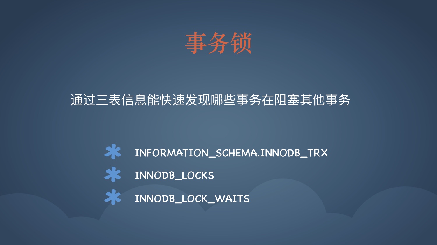 18. 事务锁 INFORMATION_SCHEMA.INNODB_TRX INNODB_LOCKS INNODB_LOCK_WAITS 通过三表信息能快速发现哪些事务在阻塞其他事务