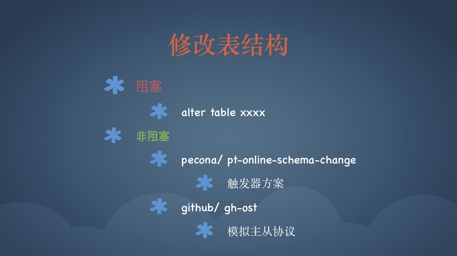 22. 修改表结构 阻塞 alter table xxxx 非阻塞 pecona/ pt-online-schema-change 触发器⽅案 github/ gh-ost 模拟主从协议