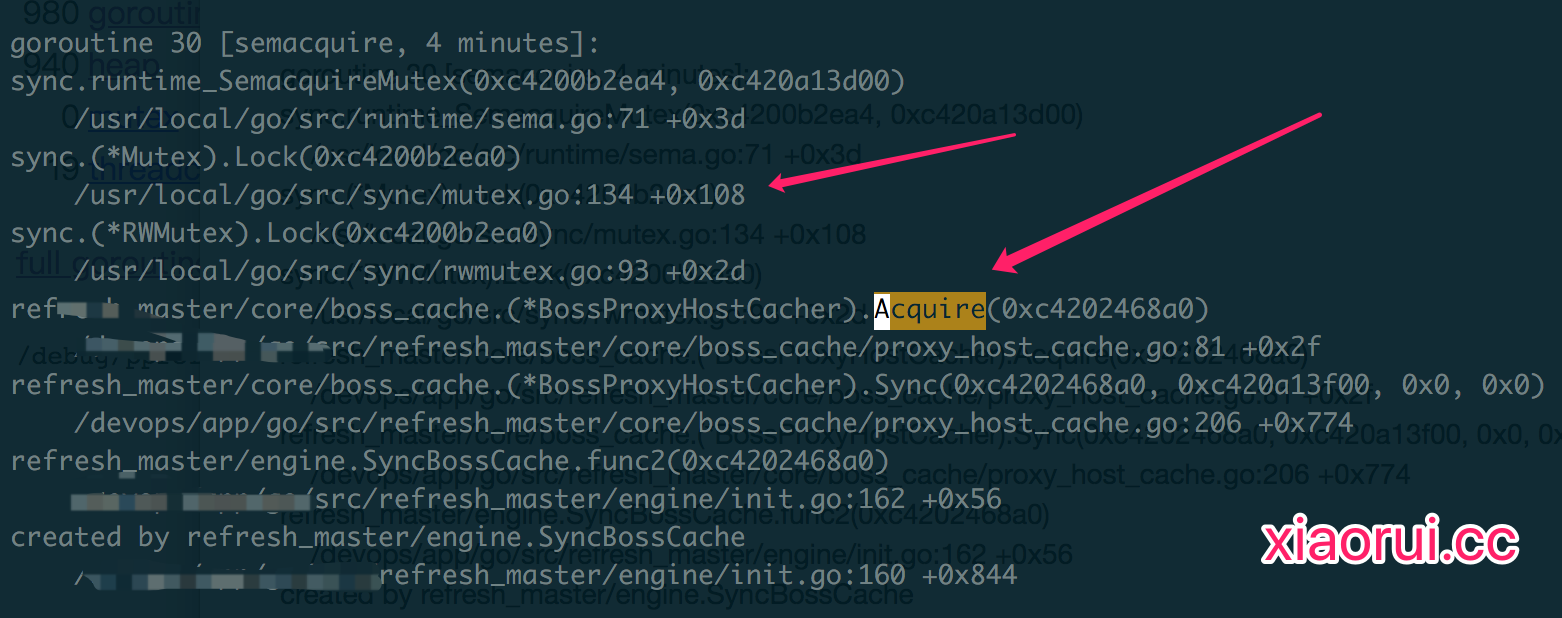 通过下面的stack输出,我们看到有在等待拿锁,但是居然等了4分钟,那么这必然是死锁的逻辑了。 进而继续分析,下面这两个不同的模块都等了4分钟的锁,那么冲突的逻辑肯定是他们了。 通过代码显示死锁的原因是出现了 锁的重用,也就说,拿到了锁,但又去拿锁, golang的sync.mutex是不可重入的,所以死锁了 !