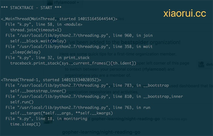 通常我们可以打印python的函数调用栈stack来分析问题。 好的,我们来跑一个下面的例子,当我们触发信号USR1的时候,该程序会向终端输出python thread stack过程信息。 其实关键方法在于traceback.print_stack(sys._current_frames()[thread.ident]) , sys_current_frames是可以拿到线程的调用栈信息。