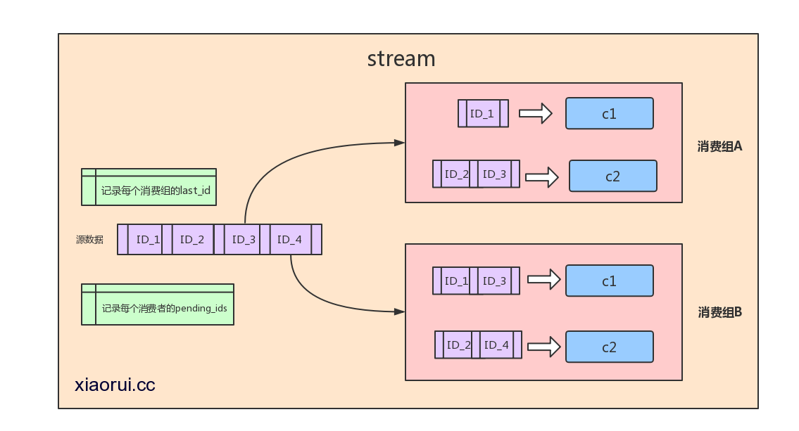 用过kafka的人再看这图就很好理解了。源数据用来存放stream数据,数据是按照有seq_id序排列的。 redis会记录stream里每个消费组最后消费的last_id及还没有返回ack确认的id数据。每个消费组都有一个last_id, 也就是说 每个消费组都可以消费同一条数据,每个消费组里可以有多个消费者,多个消费组的关系是相互竞争的。