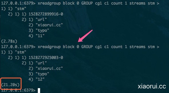 127.0.0.1:6379> xreadgroup GROUP cg1 c2 count 1 streams stm >