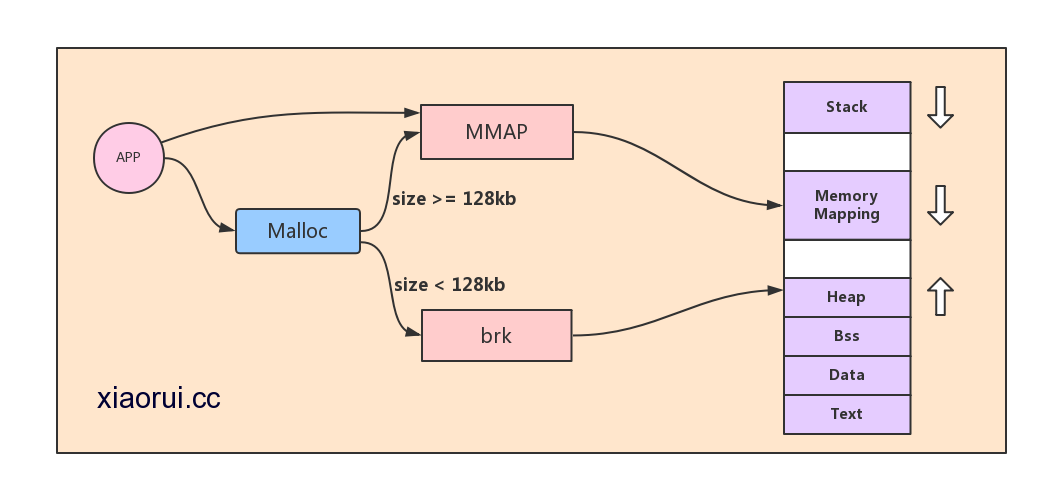 1. 即分配一块小型内存(小于或等于128kb),malloc()会调用brk()调高断点(brk是将数据段(.data)的最高地址指针_edata往高地址推),分配的内存在堆区域。