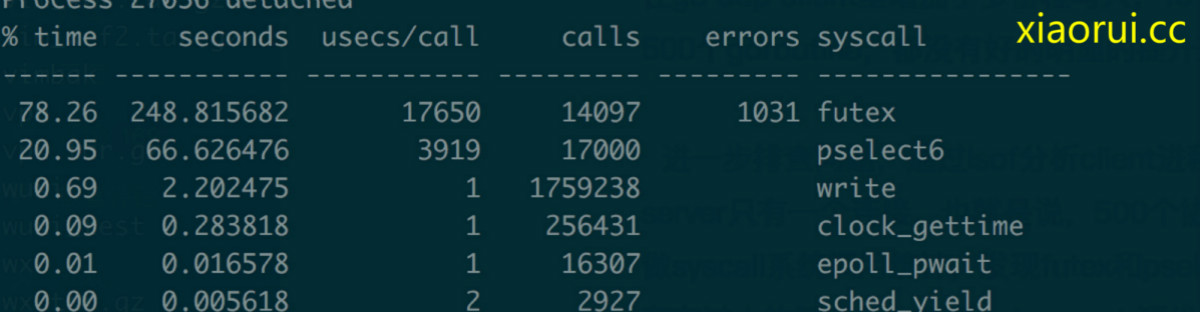 进一步排查问题,通过lsof分析client进程的描述符列表,client连接udp server只有一个连接。也就是说,500个协程共用一个连接。 接着使用strace做syscall系统调用统计,发现futex和pselect6系统调用特别多,这一看就是存在过大的锁竞争。翻看golang net 源代码,果然发现golang在往socket fd写入时,会存在写锁竞争。
