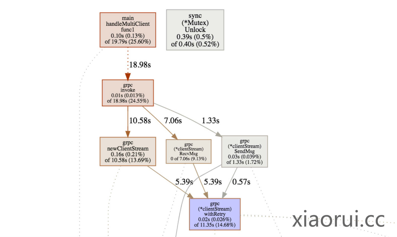 grpc的http2.0组件是自己实现的,没有采用golang标准库里的net/http。在分析代码之前,先放一个go tool pprof的耗时分析图,我们会发现有个很大的消耗在withRetry这里,分析了代码确实有一些锁的操作,而且粒度不小。 😅