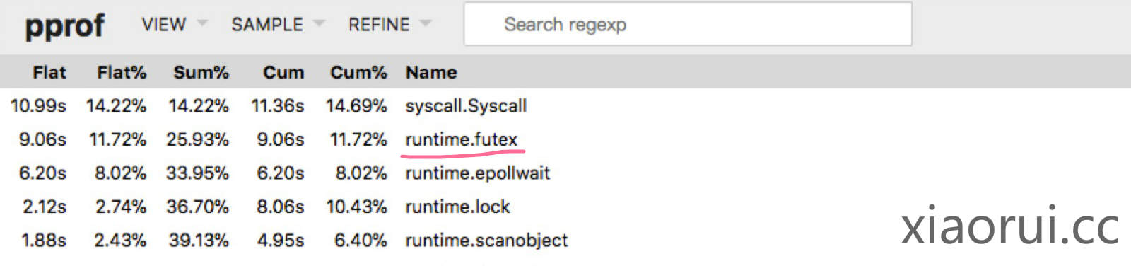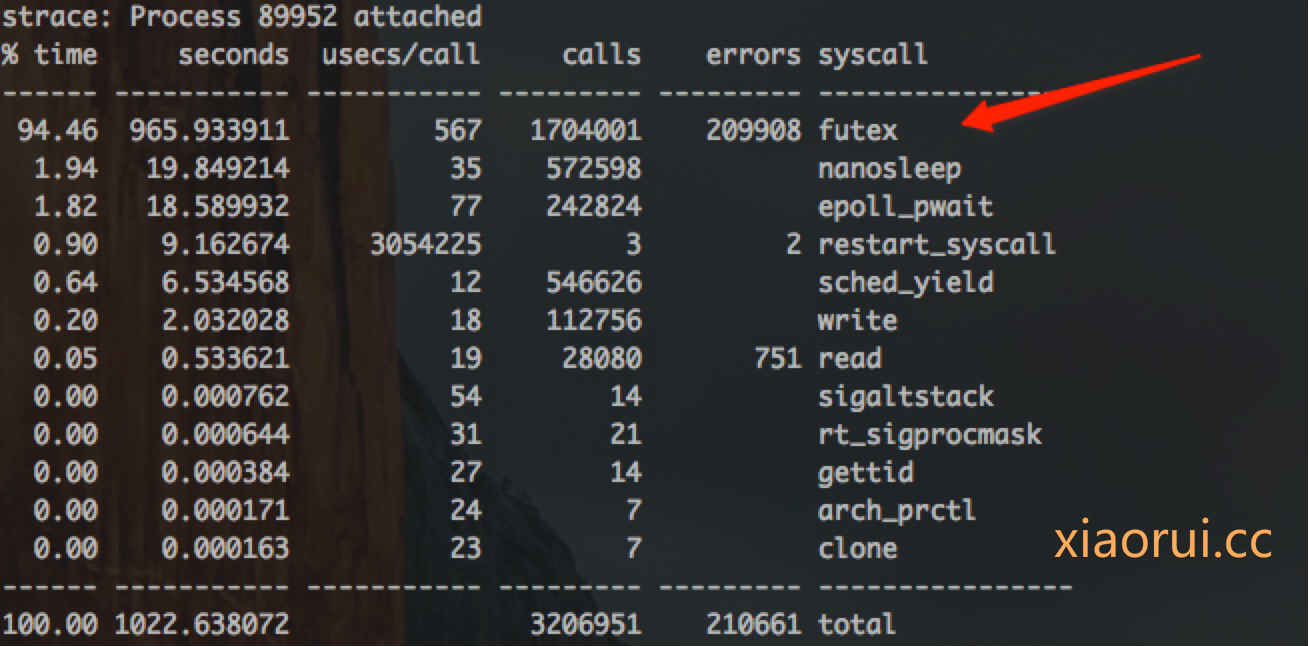 说完net/http的client的性能问题,我们在说grpc client的问题,下面是我针对gprc client压测时,strace统计的syscall系统调用。top的前两个syscall,一个是futex锁,另一个是nanosleep高精度定时器。这个数据跟net/http统计差不多情况,就此我们可以假设net/http和grpc客户端性能不足的问题是一样的。