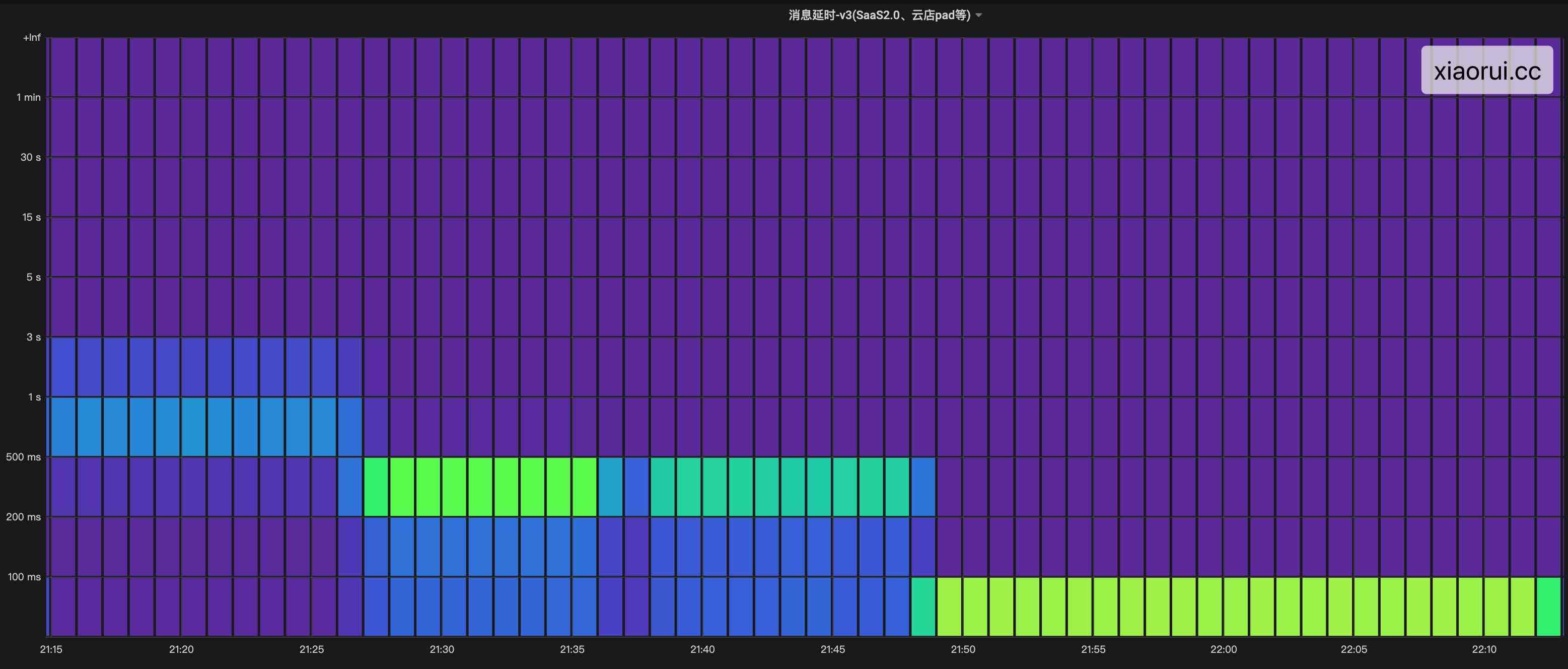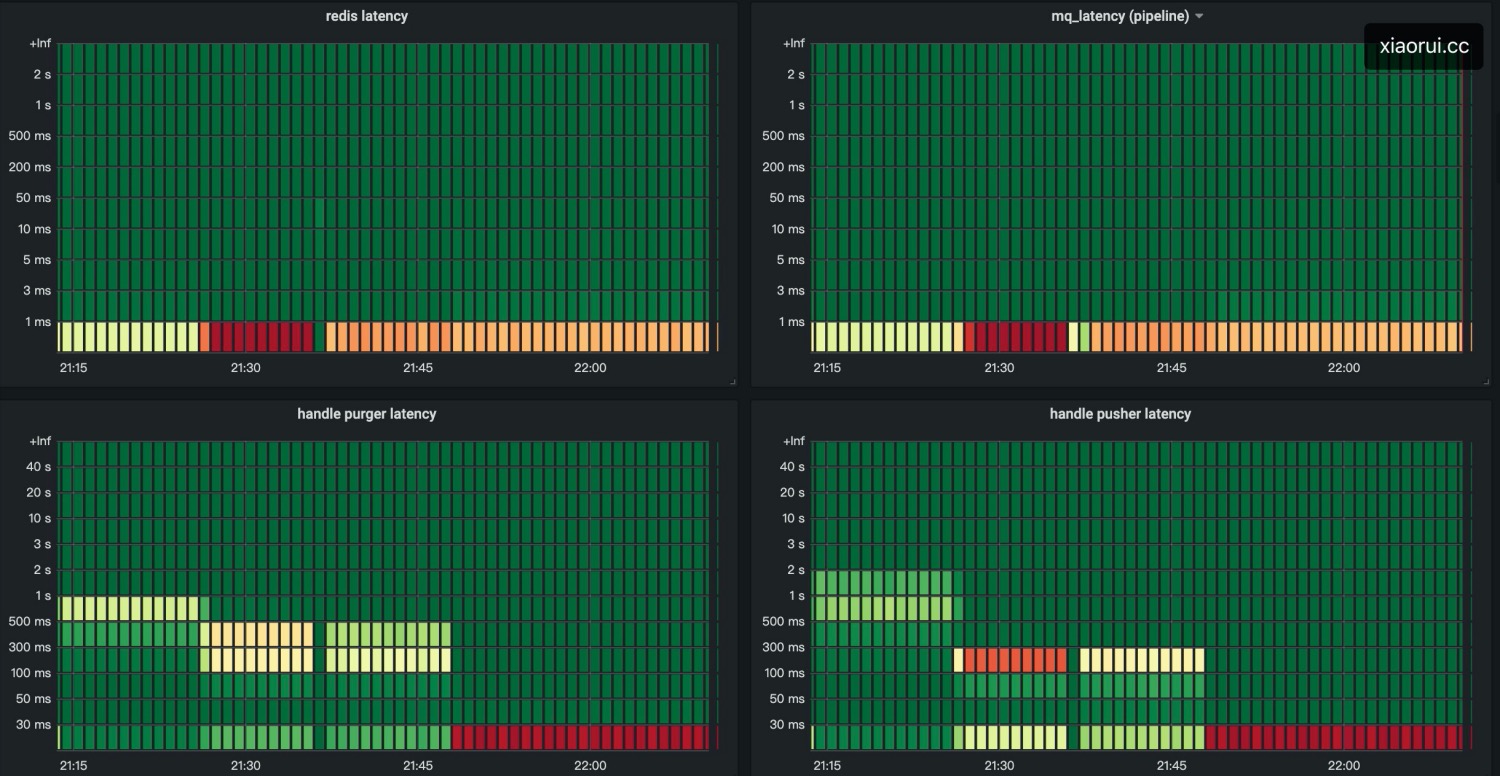 这样两个问题加起来,导致消息时延从 < 100ms 干到 < 3s 左右,通过监控看到高时延问题最少 10 来分钟。