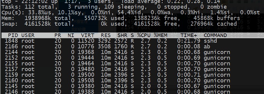 用flask做测试的时候,2000个连接用了将近6秒左右,这次用gunicorn达到了2.4秒左右。。。。。 这速度对比,已经很明了了~