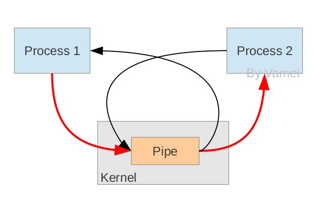 管道是由内核管理的一个缓冲区,相当于我们放入内存中的一个纸条。管道的一端连接一个进程的输出。这个进程会向管道中放入信息。管道的另一端连接一个进程的输入,这个进程取出被放入管道的信息。一个缓冲区不需要很大,它被设计成为环形的数据结构,以便管道可以被循环利用。当管道中没有信息的话,从管道中读取的进程会等待,直到另一端的进程放入信息。当管道被放满信息的时候,尝试放入信息的进程会等待,直到另一端的进程取出信息。当两个进程都终结的时候,管道也自动消失。