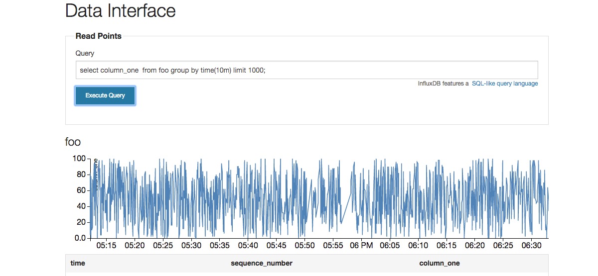 select column_one from foo where time > now() – 1h limit 1000;
