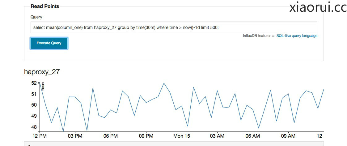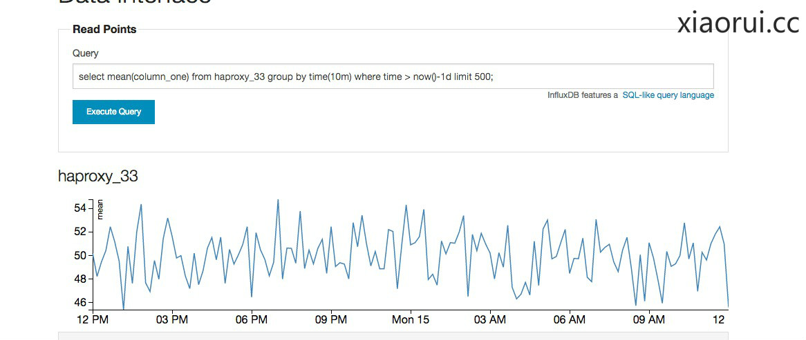 下面这个语句是,查询haproxy_33代理的数据,按照10m合并计算,计算的策略是用mean,也就是平均值的函数,后面紧接着时间间隔和limit 500 。