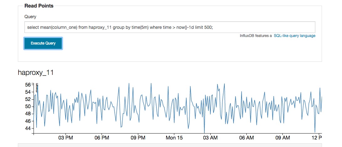 select mean(column_one) from haproxy_33 group by time(10m) where time > now()-1d limit 500;