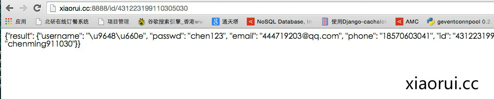 {"result": {"username": "\u9648\u660e", "passwd": "chen123", "email": "444719203@qq.com", "phone": "18570603041", "id": "431223199110305030", "login_name": "chenming911030"}}%