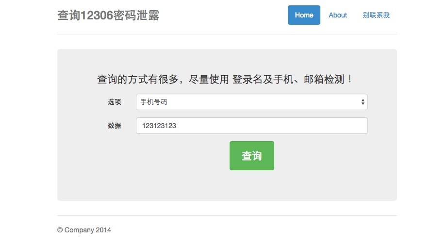 从网上搜到了关于12306的数据文件,研究了下,当然首先看下有没有 我和丽英的密码,果然没有泄露,还好!最近没干缺德事情 ! 再看看有没有缺德玩意(沈灿的),居然也没有,很是失望 !!!(哈哈)    为了让更多的人查询到自己的密码是否泄露了,这里简单做了个api,供应大家在线查询。 今天有些忙,网上写个页面,大家可以方面的进行查询 !